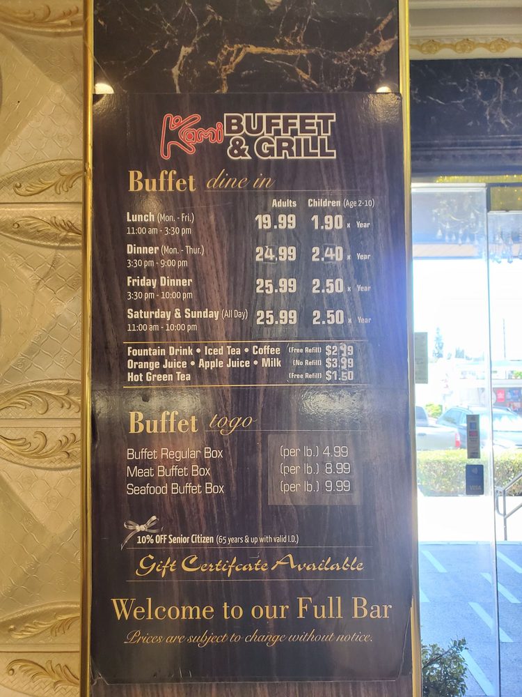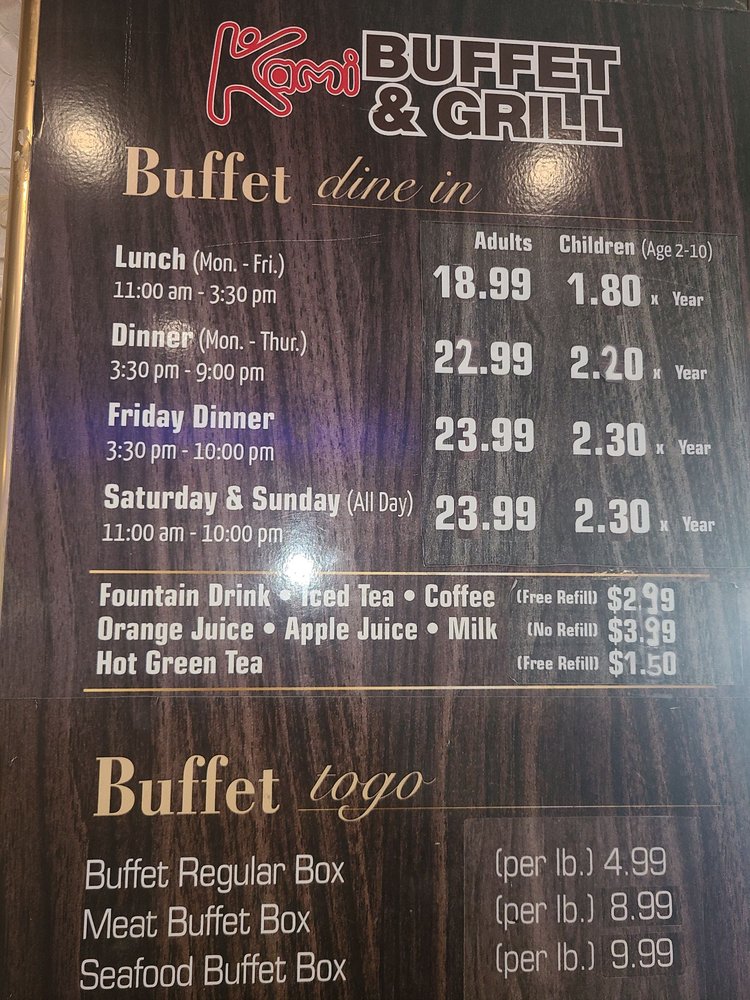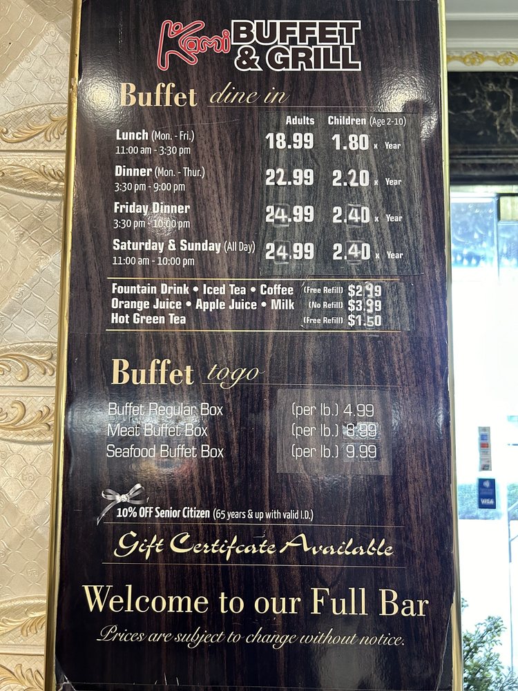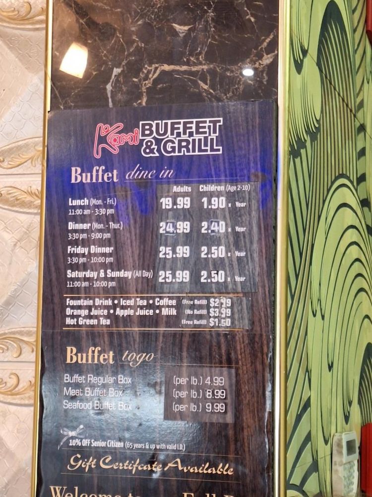 Kami Buffet & Grill, located in Rosemead, CA, offers a wide array of Asian cuisine with a focus on seafood, sushi, Chinese dishes, and desserts. The restaurant caters to various dietary preferences with vegan and vegetarian options available. Customers praise the variety, cleanliness, and friendly staff, making it a popular choice for large groups and families. The buffet style allows for unlimited servings of high-quality food at a reasonable price. Highlights include a massive sushi bar, plentiful seafood options, Mongolian BBQ, and an assortment of desserts. Despite some minor service issues during busy times, the overall experience at Kami Buffet & Grill is highly regarded by diners. Whether for brunch, lunch, or dinner, this bustling eatery offers a diverse selection of dishes in a casual setting, making it a go-to spot for satisfying Asian cuisine cravings.